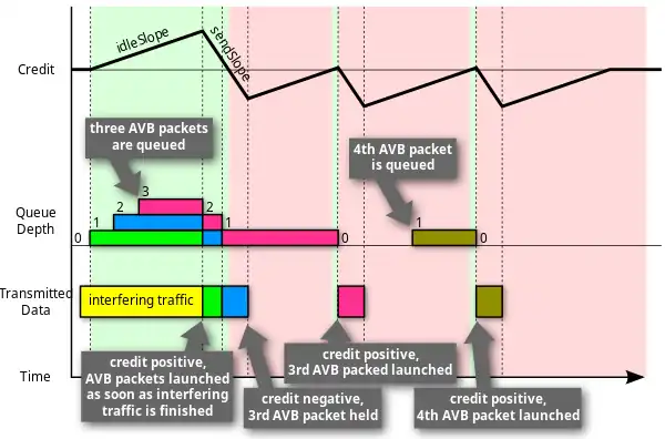 If the credit is negative and no frames are transmitted, credit increases at idleSlope rate until zero is reached. If an AVB frame cannot be transmitted because a non-AVB frame is in transmission, credit accumulates at idleSlope rate but positive credit is allowed.