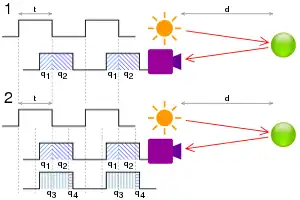 In the pulsed method (1), the distance, d = c t/2 q2/q1 + q2 , where c is the speed of light, t is the length of the pulse, q1 is the accumulated charge in the pixel when light is emitted and q2 is the accumulated charge when it is not.