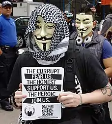 Several contingents of Anonymous have given support to the Occupy Wall Street movement, with members attending local protests and blogs run by members covering the movement.[99][100][101]