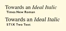 Morison described the companion italic as also being influenced by the typefaces created by the Didot family in the late 18th and early 19th centuries: a "rationalistic italic that owed nothing to the tradition of the sixteenth or seventeenth centuries. It has, indeed, more in common with the eighteenth century."[21][22][23] Morison had several years earlier attracted attention for promoting the radical idea that italics in book printing were too disruptive to the flow of text, and should be phased out.[24][25] He rapidly came to concede that the idea was impractical, and later wryly commented to historian Harry Carter that Times' italic "owes more to Didot than dogma."[10] Morison wrote in a personal letter of Times New Roman's mixed heritage that it "has the merit of not looking as if it had been designed by somebody in particular."[26][27][lower-alpha 4]