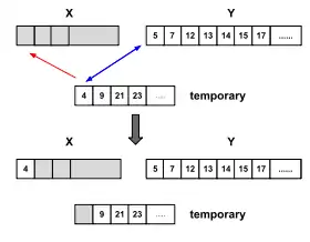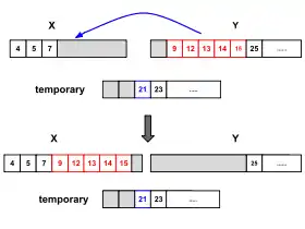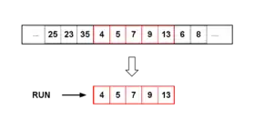 Example: two runs [1, 2, 3, 6, 10] and [4, 5, 7, 9, 12, 14, 17] must be merged. Note that both runs are already sorted individually. The smallest element of the second run is 4 and it would have to be added at the fourth position of the first run in order to preserve its order (assuming that the first position of a run is 1). The largest element of the first run is 10 and it would have to be added at the fifth position of the second run in order to preserve its order. Therefore, [1, 2, 3] and [12, 14, 17] are already in their final positions and the runs in which elements movements are required are [6, 10] and [4, 5, 7, 9]. With this knowledge, we only need to allocate a temporary buffer of size 2 instead of 4.