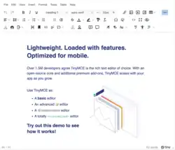 TinyMCE is designed to integrate with JavaScript libraries such as React, Vue.js, AngularJS and Bootstrap as well as content management systems such as Joomla!, and WordPress.[2]