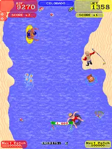 Toobin' is an Atari Games and Midway Games arcade video game released in 1988. It is based on the recreational activity tubing. Toobin' was ported to the Amiga, Commodore 64, Atari ST, Amstrad CPC, Nintendo Entertainment System, MS-DOS, Game Boy Color, ZX Spectrum, and MSX. Players assume control of tubers Bif or Jet, guiding them along vertically scrolling rivers on an inner tube.