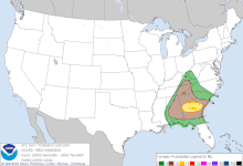 After the previous days' storms advanced into the Atlantic Ocean, a new severe weather system developed over many of the same areas in Alabama, Georgia, and South Carolina. Remnants of storms from the previous day gave way for abundant moisture overspreading the area. This, combined with the presence of upper 60s F dew points and CAPE values of 2000-3000 J/kg, created a highly unstable atmosphere, conductive for severe weather. Given the favorable parameters for severe weather, the Storm Prediction Center issued a large Enhanced risk area, encompassing areas centered around Georgia, central and northeastern portions of Alabama, eastern Tennessee, extreme western North Carolina, and southern South Carolina. The outlook highlighted the high probabilities of damaging wind gusts to be the primary threat of the event, but a 10%, unhatched corridor for tornadoes was also situated along central Georgia.[20]