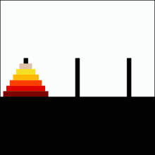 The Tower of Hanoi (also called The problem of Benares Temple[1] or Tower of Brahma or Lucas' Tower[2] and sometimes pluralized as Towers, or simply pyramid puzzle[3]) is a mathematical game or puzzle consisting of three rods and a number of disks of various diameters, which can slide onto any rod. The puzzle begins with the disks stacked on one rod in order of decreasing size, the smallest at the top, thus approximating a conical shape. The objective of the puzzle is to move the entire stack to one of the other rods, obeying the following rules:[4]