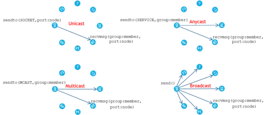 - Datagram messaging with unicast, anycast and multicast, - unreliable delivery