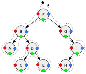 There are three methods at which position of the traversal relative to the node (in the figure: red, green, or blue) the visit of the node shall take place. The choice of exactly one color determines exactly one visit of a node as described below. Visit at all three colors results in a threefold visit of the same node yielding the “all-order” sequentialisation: