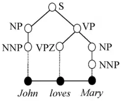 It is important to clarify the distinction between the formal representation and the file format used to store the annotated data. Treebanks are necessarily constructed according to a particular grammar. The same grammar may be implemented by different file formats. For example, the syntactic analysis for John loves Mary, shown in the figure on the right, may be represented by simple labelled brackets in a text file, like this (following the Penn Treebank notation):