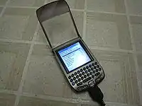 ![]() Handspring Treo 90 with charger cable plugged in | |