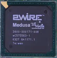 In 2000, Philips spun out its TriMedia business to TriMedia Technologies Inc. (TTI) which was a pure “IP vendor”. TTI tried unsuccessfully to create a 64 bit next generation TriMedia CPU architecture. This venture was ill-timed, as it was right at the start of the Dot-com recession. In 2003 what was left of TTI was re-absorbed within Philips.[2]