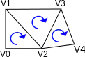 Similarly, reversal of strips’ vertices will result in the same set of triangles if the strip has an even number of vertices. (e.g. strip FEDCBA will represent the same triangles FED,ECD,DCB,CAB as the original strip). However, if a strip has an odd number of vertices then the reversed strip will represent triangles with opposite orientation. For example, reversal of a strip ABCDE will result in strip EDCBA which represents triangles EDC, DBC, CBA).