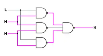 Assuming the Boolean function computed by the three identical logic gates has value 1, then: (a) if no circuit has failed, all three circuits produce an output of value 1, and the majority gate output has value 1. (b) if one circuit fails and produces an output of 0, while the other two are working correctly and produce an output of 1, the majority gate output is 1, i.e., it still has the correct value. And similarly for the case when the Boolean function computed by the three identical circuits has value 0. Thus, the majority gate output is guaranteed to be correct as long as no more than one of the three identical logic circuits has failed.[7]