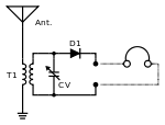 The simplest tuner consists of an inductor and capacitor connected in parallel, where the capacitor or inductor is made to be variable. This creates a resonant circuit which responds to an alternating current at one frequency. Combined with a detector, also known as a demodulator (diode D1 in the circuit), it becomes the simplest radio receiver, often called a crystal set.