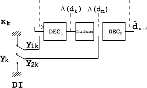 An interleaver installed between the two decoders is used here to scatter error bursts coming from output. DI block is a demultiplexing and insertion module. It works as a switch, redirecting input bits to at one moment and to at another. In OFF state, it feeds both and inputs with padding bits (zeros).