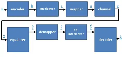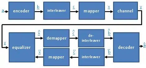 The block diagram of a communication system employing a turbo equalizer is shown below. The turbo equalizer encompasses the equalizer, the decoder, and the blocks in between.
