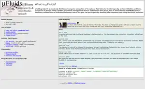 μFluids@Home is a computer simulation of two-phase flow behavior in microgravity and microfluidics[1] problems at Purdue University, using the Surface Evolver program.