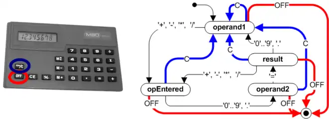 Though the traditional FSMs are an excellent tool for tackling smaller problems, it's also generally known that they tend to become unmanageable, even for moderately involved systems. Due to the phenomenon known as state and transition explosion, the complexity of a traditional FSM tends to grow much faster than the complexity of the system it describes. This happens because the traditional state machine formalism inflicts repetitions. For example, if you try to represent the behavior of a simple pocket calculator with a traditional FSM, you'll immediately notice that many events (e.g., the Clear or Off button presses) are handled identically in many states. A conventional FSM shown in the figure below, has no means of capturing such a commonality and requires repeating the same actions and transitions in many states. What's missing in the traditional state machines is the mechanism for factoring out the common behavior in order to share it across many states.