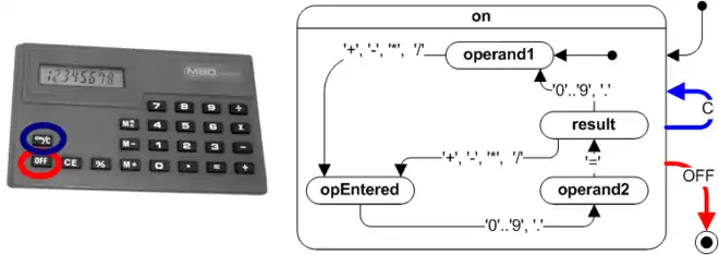 However, composite states don't simply hide complexity; they also actively reduce it through the powerful mechanism of hierarchical event processing. Without such reuse, even a moderate increase in system complexity could lead to an explosive increase in the number of states and transitions. For example, the hierarchical state machine representing the pocket calculator (Figure 3) avoids repeating the transitions Clear and Off in virtually every state. Avoiding repetition allows the growth of HSMs to remain proportionate to growth in system complexity. As the modeled system grows, the opportunity for reuse also increases and thus potentially counteracts the disproportionate increase in numbers of states and transitions typical of traditional FSMs.