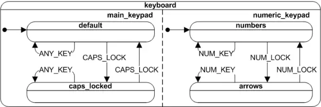 Orthogonal regions address the frequent problem of a combinatorial increase in the number of states when the behavior of a system is fragmented into independent, concurrently active parts. For example, apart from the main keypad, a computer keyboard has an independent numeric keypad. From the previous discussion, recall the two states of the main keypad already identified: "default" and "caps_locked" (see Figure 1). The numeric keypad also can be in two states—"numbers" and "arrows"—depending on whether Num Lock is active. The complete state space of the keyboard in the standard decomposition is therefore the Cartesian product of the two components (main keypad and numeric keypad) and consists of four states: "default–numbers," "default–arrows," "caps_locked–numbers," and "caps_locked–arrows." However, this would be an unnatural representation because the behavior of the numeric keypad does not depend on the state of the main keypad and vice versa. The use of orthogonal regions allows the mixing of independent behaviors as a Cartesian product to be avoided and, instead, for them to remain separate, as shown in Figure 4.