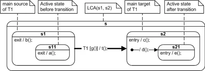 In UML, a state transition can directly connect any two states. These two states, which may be composite, are designated as the main source and the main target of a transition. Figure 7 shows a simple transition example and explains the state roles in that transition. The UML specification prescribes that taking a state transition involves executing the following actions in the following sequence (see Section 15.3.14 in OMG Unified Modeling Language (OMG UML), Infrastructure Version 2.2[1]):