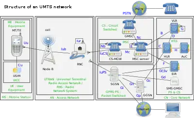 UMTS specifies a complete network system, which includes the radio access network (UMTS Terrestrial Radio Access Network, or UTRAN), the core network (Mobile Application Part, or MAP) and the authentication of users via SIM (subscriber identity module) cards.