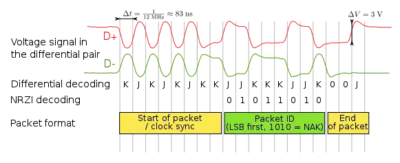 USB data is transmitted by toggling the data lines between the J state and the opposite K state. USB encodes data using the NRZI line coding: