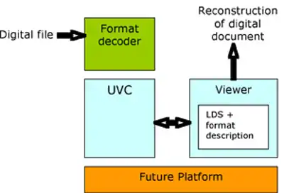 Together with the original data it is possible to reconstruct the meaning of each particular digital object. The UVC can be seen as the heart of the system. Like the Java Virtual Machine and the Common Language Runtime, the UVC is actually an emulator which allows a program to run on virtual instances of the necessary, usually obsolete, hardware, and will continue to emulate the necessary hardware as technology continues to evolve. Because we do not know at this time which hardware is available in the future, the UVC must be created at the time we want to access a particular document from the repository. The UVC forms the platform on which programs specifically written for the UVC can run.