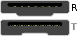 The external and embedded connector implementations were electrically compatible and physically similar, each with a single row of contacts, but they had different form factors and contact counts. The "embedded" implementation was only specified for the display panel interface and had a single row of 26 contacts, while the "external" implementation had a single row of 22 contacts inside a metal shield with a physically keyed rectangular cross-section, resembling the USB Type A connectors.[13]: §7.2.2, 7.3.2 The contacts were spaced on a pitch of 0.6 mm (0.024 in) (external)[13]: §7.2.2 and 1.0 mm (0.039 in) (embedded).[13]: §7.3.2