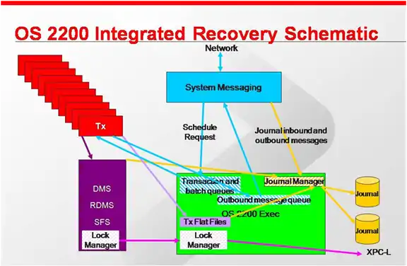 The heart of the database and transaction system is Integrated Recovery. “Integrated” implies the integration of all data models, the transaction file manager, the transaction scheduler, and the message queues. All activity in all of these areas is journaled (written to the audit trail). The audit trail is managed by the Exec which ensures synchronization for all users.[6]