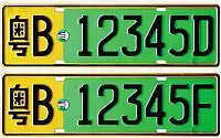 Black lettering on Gradient green Start with D (stands for 电) and A, B, C, E is for regular EV vehicles, start with F (stands for 非电) and G, H, J, K is for regular plug-in HEV vehicles