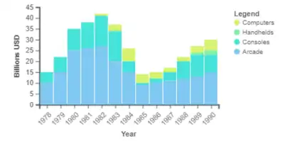 The crash in 1983 had the largest impact in the United States. It rippled through all sectors of the global video game market worldwide, though sales of video games still remained strong in Japan, Europe, and Canada from the beleaguered American companies.[55] It took several years for the U.S. industry to recover. The estimated US$42 billion worldwide market in 1982, including arcade, console, and computer games, dropped to US$14 billion by 1985. There was also a significant shift in the home video game market, away from consoles to personal computer software, between 1983 and 1985.[54]