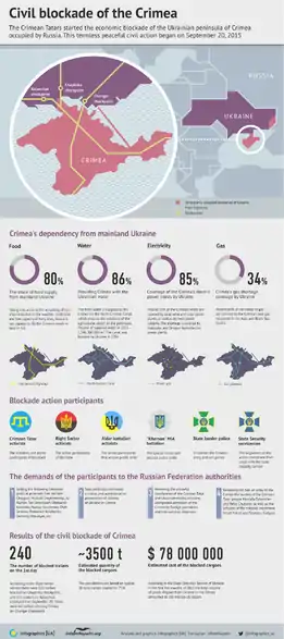 - "Became known the first effects of the food blockade of the occupied Crimea - Infographics". The Ukrainian Week. September 22, 2015.