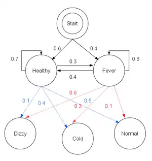 The observations (normal, cold, dizzy) along with the hidden states (healthy, fever) form a hidden Markov model (HMM). From past experience, the probabilities of this model have been estimated as:
