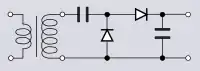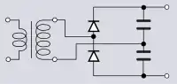 The Delon circuit uses a bridge topology for voltage doubling;[p 6] consequently it is also called a full-wave voltage doubler.[2] This form of circuit was, at one time, commonly found in cathode ray tube television sets where it was used to provide an extra high tension (EHT) supply. Generating voltages in excess of 5 kV with a transformer has safety issues in terms of domestic equipment and in any case is uneconomical. However, black and white television sets required an e.h.t. of 10 kV and colour sets even more. Voltage doublers were used to either double the voltage on an e.h.t winding on the mains transformer or were applied to the waveform on the line flyback coils.[7]