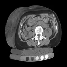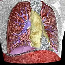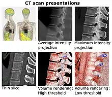 Volume rendering is distinguished from thin slice tomography presentations, and is also generally distinguished from projections of 3D models, including maximum intensity projection.[1] Still, technically, all volume renderings become projections when viewed on a 2-dimensional display, making the distinction between projections and volume renderings a bit vague. Nevertheless, the epitomes of volume rendering models feature a mix of for example coloring[2] and shading[3] in order to create realistic and/or observable representations.