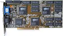 Each of the three chips present on the card has its own 64-bit RAM interface, giving the card a "total" bus width of 192 bits or 800 MB/s per chip. The Voodoo2 has an increased chip-count compared to the original two-chip Voodoo card. Competing products such as the ATI Rage Pro, NVIDIA RIVA 128, and Rendition Verite 2x00 are single-chip products, each with integrated 2D GUI/VGA accelerators. As with the original Voodoo, the Voodoo2 is a dedicated 3D accelerator, and has to be used in conjunction with a conventional 2D graphics card. It requires an external pass-through VGA cable hooked up from the 2D card into the Voodoo card’s passthrough VGA port.