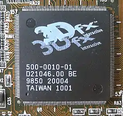 The Voodoo2 (or Voodoo2) is a set of three specialized 3D graphics chips on a single chipset setup, made by 3dfx. It was released in February 1998 as a replacement for the original Voodoo Graphics chipset. The card runs at a chipset clock rate of 90 MHz and uses 100 MHz EDO DRAM, and is available for the PCI interface. The Voodoo2 comes in two models, one with 8 MB RAM and one with 12 MB RAM. The 8 MB card has 2 MB of memory per texture mapping unit (TMU) vs. 4 MB on the 12 MB model. The 4 MB framebuffer on both cards support a maximum screen resolution of 800 × 600, while the increased texture memory on the 12 MB card allows more detailed textures. Some boards with 8 MB can be upgraded to 12 MB with an additional daughter board.