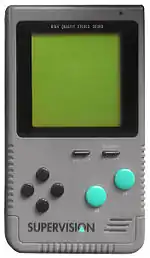 The Watara Supervision, also known as the QuickShot Supervision in the UK, is a monochrome handheld game console, originating from Asia, and introduced in 1992 as a cut-price competitor for Nintendo's Game Boy.[1] It came packaged with a game called Crystball, which is similar to Breakout. One unique feature of the Supervision was that it could be linked up to a television via an official accessory. Games played in this way would display in four colors, much like Nintendo's Super Game Boy add-on for the SNES.[1] A full color TV link was also in the works, but because of the Supervision's failure to make a major impression among gamers it was cancelled, along with the games which were in development for it.