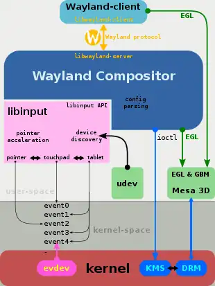 - The evdev module of the Linux kernel gets an event and sends it to the Wayland compositor.