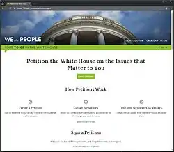 We the People, launched by the Obama administration on September 22, 2011,[1] is a defunct section of the whitehouse.gov website used for petitioning the administration's policy experts. Petitions that reached a certain threshold of signatures were reviewed by Administration officials who in most instances would subsequently provide an official response.[1] Legal proceedings in the United States were not subject to petitions, rather, the site served as a public relations mechanism for the presidential administration to provide a venue for citizens to express themselves. On August 23, 2012, the White House Director of Digital Strategy Macon Phillips released the source code for the platform.[2] The source code is available on GitHub, and lists both public domain status as a work of the United States federal government and licensing under the GPL v2.[3]