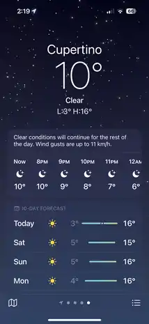 ![]() The Weather app on iOS 16 showing current weather information and forecast for Cupertino | |