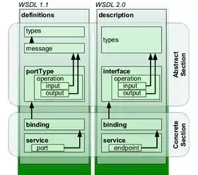 | Message | — | Typically, a message corresponds to an operation. The message contains the information needed to perform the operation. Each message is made up of one or more logical parts. Each part is associated with a message-typing attribute. The message name attribute provides a unique name among all messages. The part name attribute provides a unique name among all the parts of the enclosing message. Parts are a description of the logical content of a message. In RPC binding, a binding may reference the name of a part in order to specify binding-specific information about the part. A part may represent a parameter in the message; the bindings define the actual meaning of the part. Messages were removed in WSDL 2.0, in which XML schema types for defining bodies of inputs, outputs and faults are referred to simply and directly. |