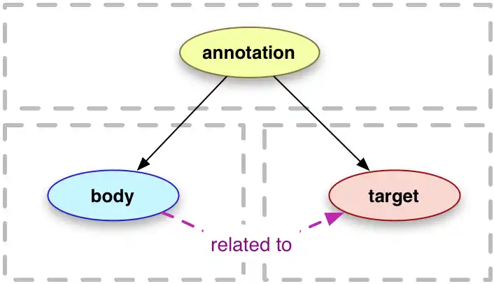 [a]n annotation is considered to be a set of connected resources, typically including a body and target, and conveys that the body is related to the target. The exact nature of this relationship changes according to the intention of the annotation, but the body is most frequently somehow "about" the target. (...) The (...) model supports additional functionality, enabling content to be embedded within the annotation, selecting arbitrary segments of resources, choosing the appropriate representation of a resource and providing styling hints to help clients render the annotation appropriately.