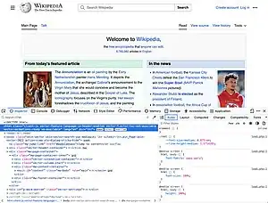 In addition to selecting and editing, the HTML elements panels will usually also display properties of the DOM object, such as display dimension, and CSS properties.[17]