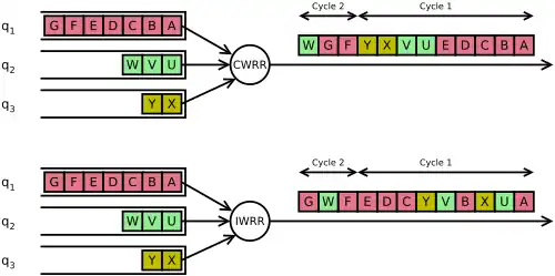 Let , be the maximum weight. In IWRR,[1][5] each cycle is split into rounds. A queue with weight can emit one packet at round only if .