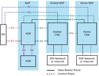 The WiMAX forum proposal defines a number of components, plus some of the interconnections (or reference points) between these, labeled R1 to R5 and R8: