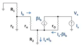 Output resistance is found using a small-signal model for the circuit, shown in Figure 2. Transistor Q1 is replaced by its small-signal emitter resistance rE because it is diode connected.[10] Transistor Q2 is replaced with its hybrid-pi model. A test current Ix is attached at the output.