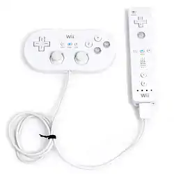 The Classic Controller is an extension for the Wii Remote, released alongside the Wii in November 2006. Its form factor is similar to classic gamepads such as that for the Super Nintendo Entertainment System, with a d-pad, four face buttons, Start and Select buttons alongside the Wii connection button, and two shoulder buttons. Players can use it with older games from the Virtual Console in addition to games designed for the Wii.[104] In 2009, Nintendo released the Wii Classic Controller Pro, which was modelled after the GameCube's form factor and included two analog sticks.[105]