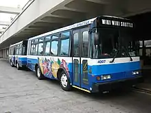 WikiWikiWeb was the first wiki.[14] Ward Cunningham started developing WikiWikiWeb in Portland, Oregon, in 1994, and installed it on the Internet domain c2.com on March 25, 1995. It was named by Cunningham, who remembered a Honolulu International Airport counter employee telling him to take the "Wiki Wiki Shuttle" bus that runs between the airport's terminals. According to Cunningham, "I chose wiki-wiki as an alliterative substitute for 'quick' and thereby avoided naming this stuff quick-web."[15][16]