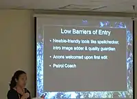 The MediaWiki software allows users to add, delete, and otherwise modify content. Like other wikis, quality control is achieved by reviewing edits via the "Recent Changes" page and using a diff feature to compare revisions of an article and highlight changes in the content.[19][10] Other users review these changes and may accept or reject the edits based on guidelines regarding content and style.
